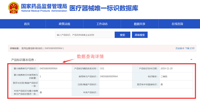 為方便社會(huì)公眾查詢,醫(yī)療器械唯一標(biāo)識(shí)數(shù)據(jù)庫首頁設(shè)置了查詢功能和高級(jí)查詢(圖1所示),滿足用戶多條件、多角度的查詢要求。數(shù)據(jù)查詢?cè)斍榘串a(chǎn)品標(biāo)識(shí)不同特點(diǎn)展示(圖2所示),同時(shí)設(shè)置了查詢數(shù)據(jù)的折疊或展開、下載、打印、歷史版本記錄等輔助功能,滿足用戶多樣化需求。