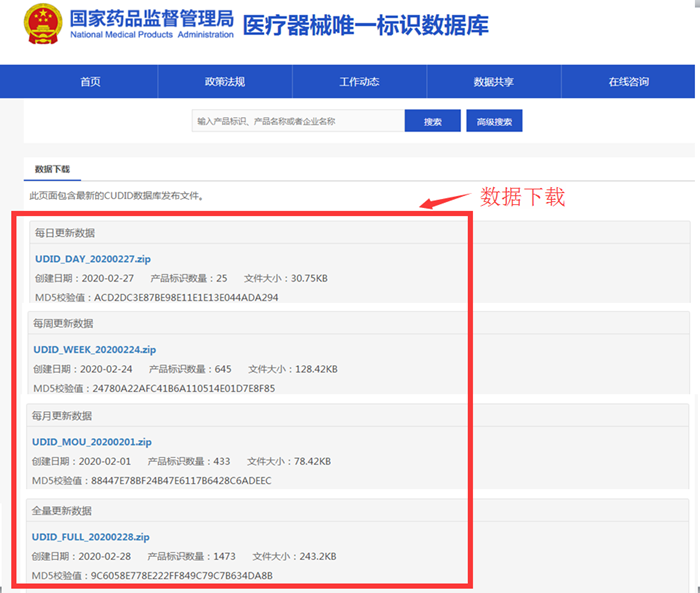 醫(yī)療器械唯一標(biāo)識(shí)數(shù)據(jù)庫設(shè)置了數(shù)據(jù)下載功能,點(diǎn)擊首頁“數(shù)據(jù)共享”欄目進(jìn)入“數(shù)據(jù)下載”功能頁面(圖3所示),提供全量、每月、每周、每日等批量數(shù)據(jù)包下載,同時(shí)提供數(shù)據(jù)包的創(chuàng)建時(shí)間、數(shù)據(jù)條數(shù)、文件大小等內(nèi)容。